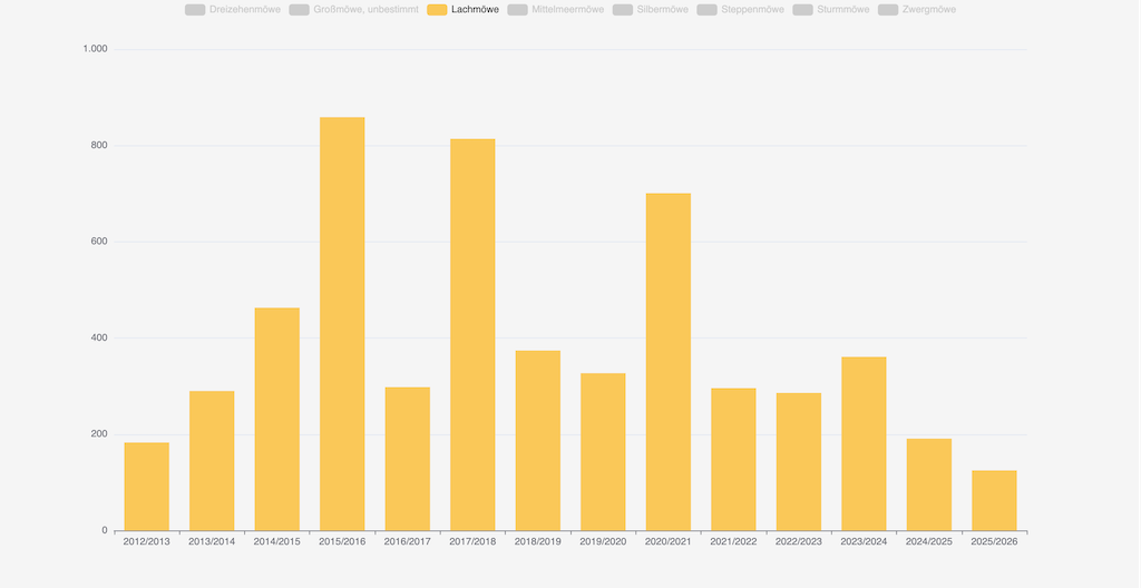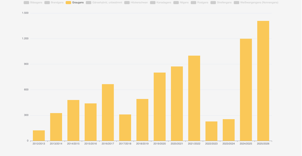 Die folgenden beiden Abbildungen zeigen die Entwicklungen der Graugänse (deutliche Zunahme) und der Lachmöwen (in den lezten Jahren Stagnation) seit 2012: